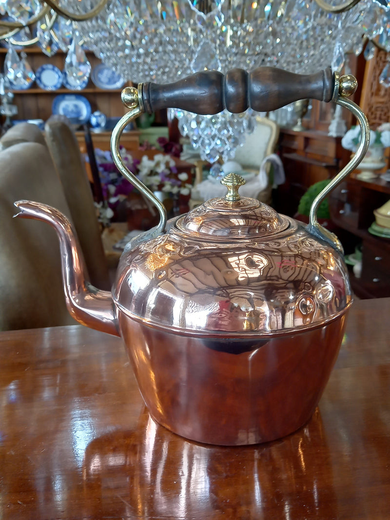非常漂亮的一款产品,铜制壶身和壶盖,配有黄铜旋钮,以及黄铜手柄和旋转木柄。壶嘴完好无损,壶盖可拆卸。手柄接头已修复。最近经过专业抛光。